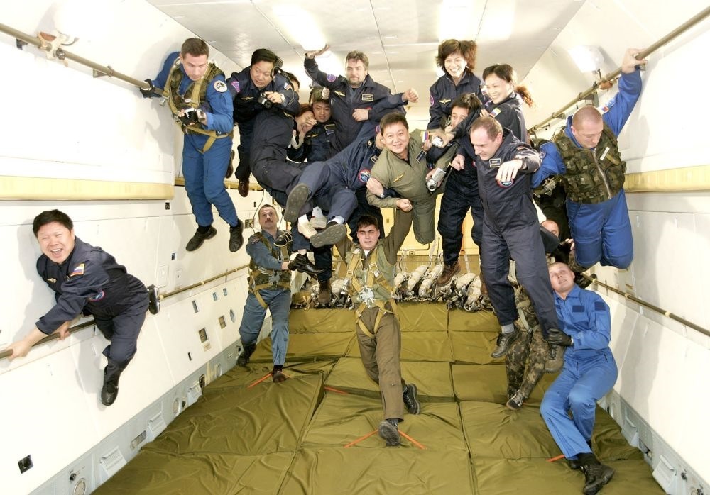 2004年12月17日,在俄羅斯首都莫斯科的加加林阿特拉斯宇航中心,10名中國游客在俄羅斯宇航員的保護下體驗太空失重訓練。