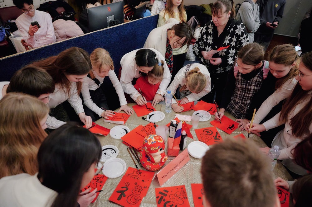 2025年2月3日,俄羅斯圣彼得堡學生在中小學春節(jié)聯(lián)歡節(jié)上體驗中國書法。