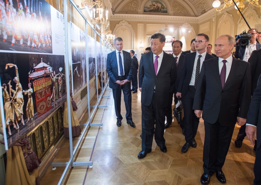 2019年6月5日,國家主席習近平和俄羅斯總統(tǒng)普京在莫斯科大劇院共同出席中俄建交70周年紀念活動。這是兩國元首共同參觀中俄建交70周年圖片展。