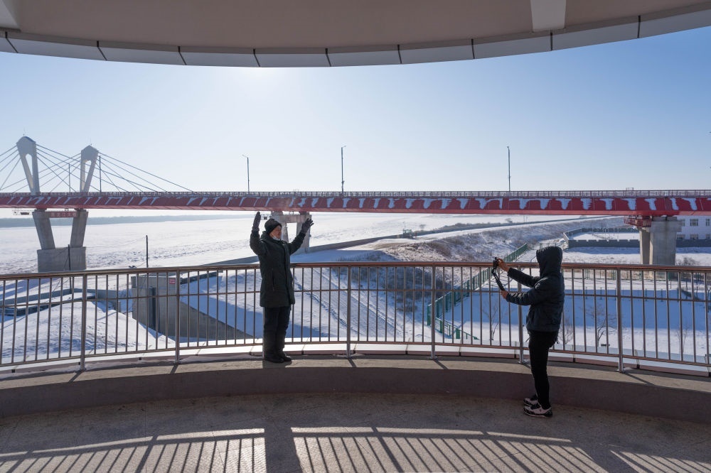 2024年1月30日,游客在黑龍江省黑河市黑龍江大橋公園內(nèi)的觀光塔上留影。黑河—布拉戈維申斯克黑龍江大橋于2022年6月10日正式通車,是中俄首座跨黑龍江(俄羅斯稱阿穆爾河)界河公路橋,在中國東北地區(qū)和俄羅斯遠東地區(qū)之間開辟了新的國際運輸通道。