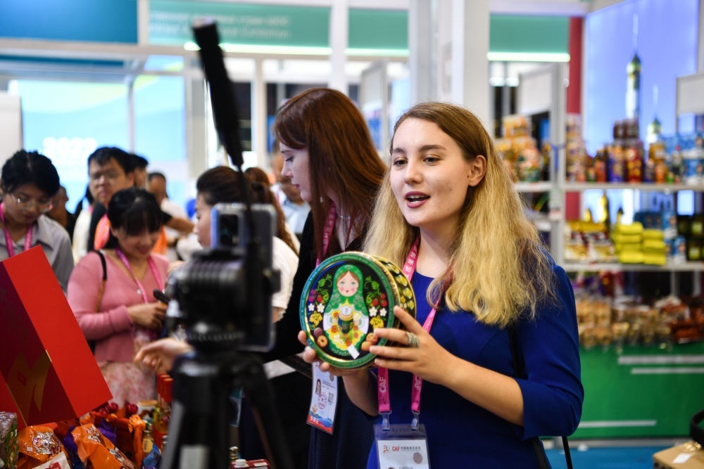 2023年9月19日,來自俄羅斯的參展商在陜西楊凌農(nóng)高會展臺進行直播。