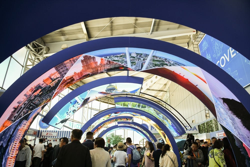 2024年5月18日,人們走進在哈爾濱國際會展中心舉行的第八屆中俄博覽會展館。