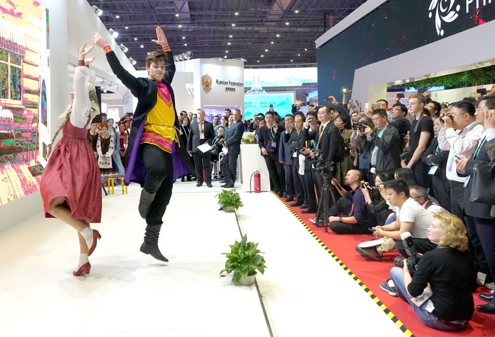2018年11月6日,俄羅斯演員在上海舉行的首屆中國國際進口博覽會俄羅斯展區(qū)表演舞蹈。