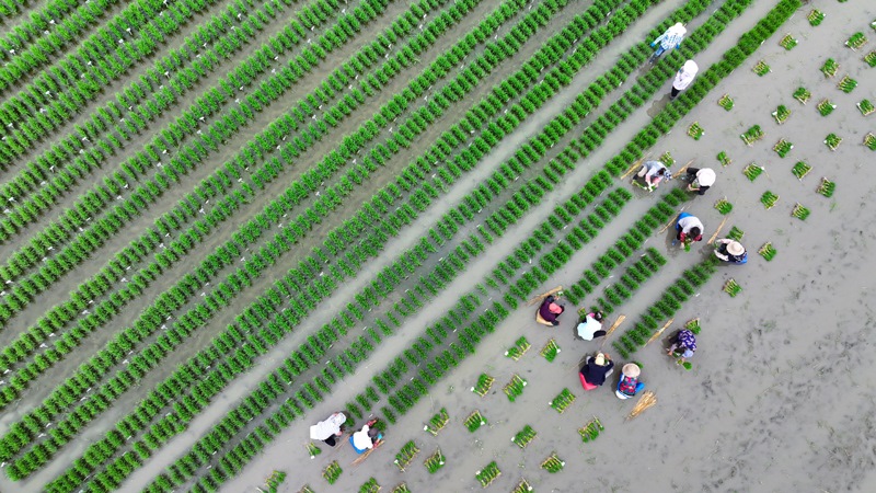 6月14日,在江蘇省興化市陳堡鎮(zhèn)蔣莊村,農(nóng)民在田間將剛起的秧苗裝車(無人機照片)。