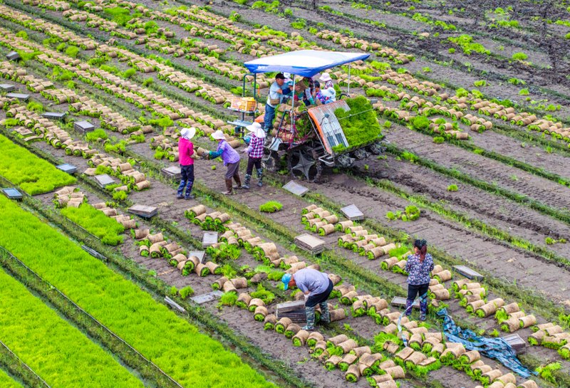 6月14日,在江蘇里下河地區(qū)農(nóng)科所(揚州市農(nóng)科院),農(nóng)民在田里起秧、運秧(無人機照片)。