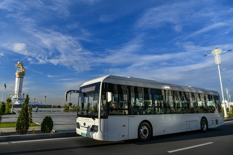 這是2023年11月26日在土庫(kù)曼斯坦阿爾卡達(dá)格拍攝的電動(dòng)公交車。新華社記者 曹陽(yáng) 攝