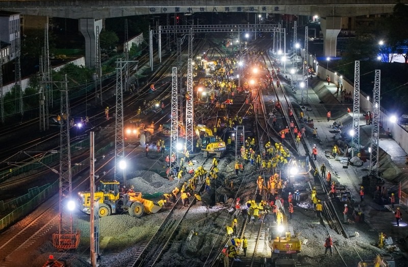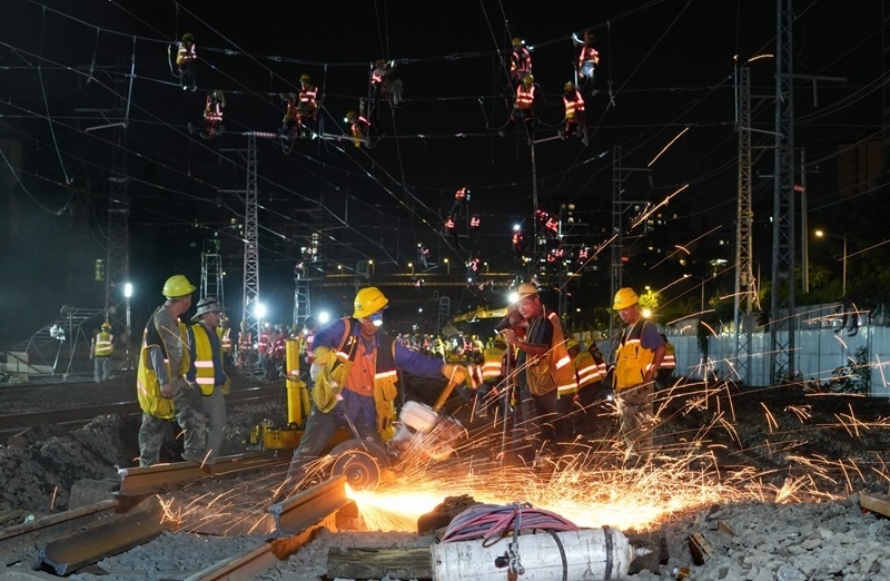 6月19日,在成渝中線高鐵成都站南北站場交替施工現場,中鐵八局施工人員在拆除原來的軌道和枕木,上方中國中鐵電氣化局的施工人員在進行接觸網施工作業(yè)。
