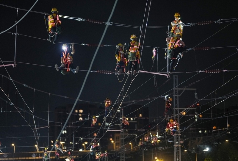 6月19日,在成渝中線高鐵成都站南北站場交替施工現場,中國中鐵電氣化局的施工人員在南站場進行接觸網施工作業(yè)。