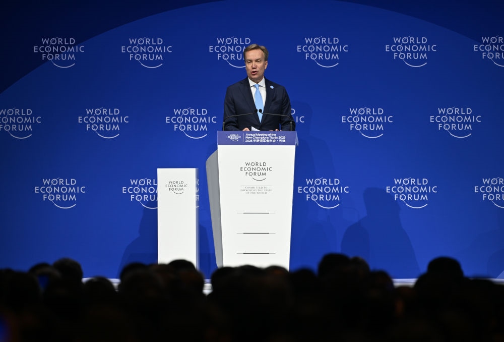 6月25日,世界經(jīng)濟(jì)論壇總裁博爾格·布倫德在2025夏季達(dá)沃斯論壇開(kāi)幕式上發(fā)言。新華社記者 孫凡越 攝