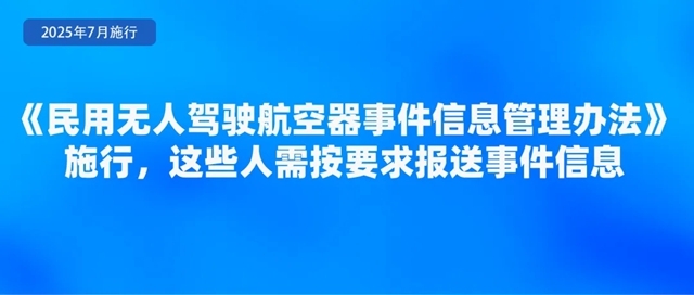 為規(guī)范民用無(wú)人駕駛航空器事件信息的管理,準(zhǔn)確掌握有關(guān)無(wú)人駕駛航空器安全運(yùn)行信息,及時(shí)發(fā)現(xiàn)安全隱患,控制運(yùn)行風(fēng)險(xiǎn),日前,民航局印發(fā)《民用無(wú)人駕駛航空器事件信息管理辦法》,自7月1日起施行?!掇k法》要求,特定類和審定類合格證持有人、擁有中型和大型無(wú)人駕駛航空器50架(含)以上的開(kāi)放類合格證持有人、擁有大型無(wú)人駕駛航空器10架(含)以上的開(kāi)放類合格證持有人應(yīng)當(dāng)制定事件信息管理程序,指定滿足條件的人員負(fù)責(zé)事件信息管理,并按要求報(bào)送事件信息。事發(fā)相關(guān)單位和人員應(yīng)當(dāng)按照規(guī)定如實(shí)報(bào)告事件信息,不得瞞報(bào)、謊報(bào)或者遲報(bào)。