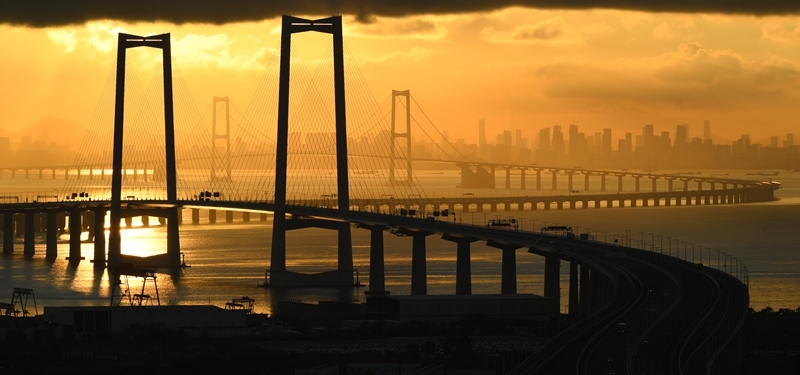 9月14日拍攝的沐浴在晨曦之中的深中通道與遠處的深圳市區(qū)。