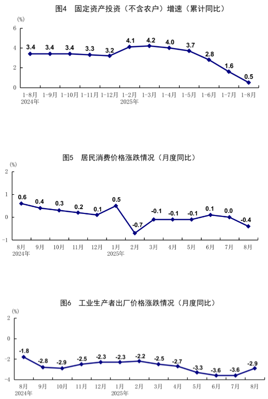 8月份,全國工業(yè)生產(chǎn)者出廠價格同比下降2.9%,降幅比上月收窄0.7個百分點,環(huán)比持平;全國工業(yè)生產(chǎn)者購進(jìn)價格同比下降4.0%,降幅收窄0.5個百分點,環(huán)比持平。1—8月份,全國工業(yè)生產(chǎn)者出廠價格和購進(jìn)價格同比分別下降2.9%、3.3%。