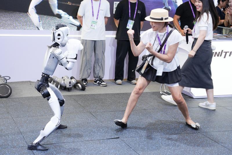 2025年9月19日,在廣西南寧國(guó)際會(huì)展中心人工智能專館,一臺(tái)人形機(jī)器人和觀眾表演拳擊。新華社記者 周汀鷺 攝