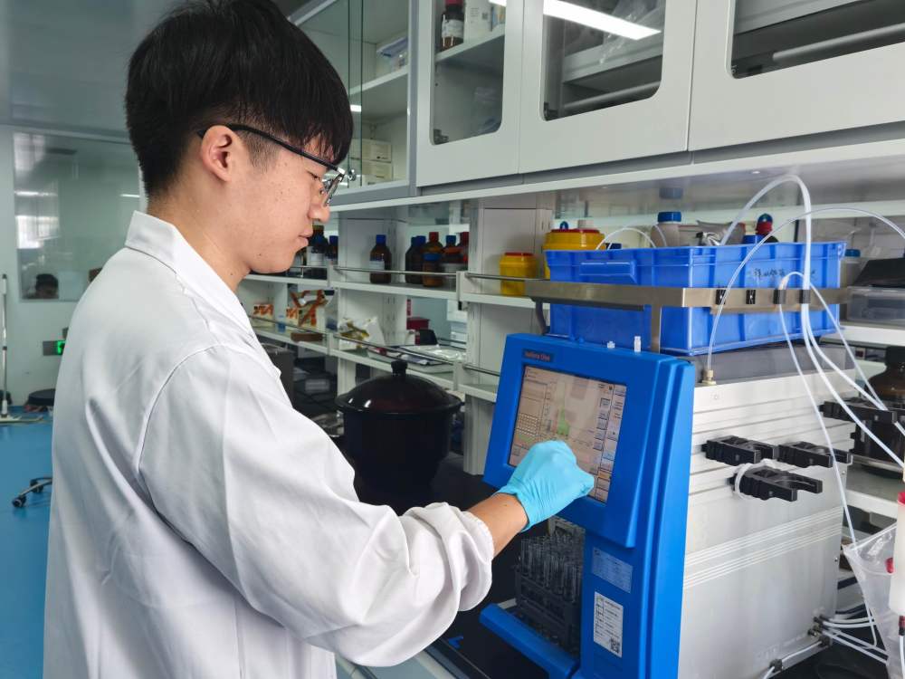 合源生物科技(天津)有限公司工作人員在生產(chǎn)基地的檢測室進(jìn)行檢測。新華社記者 趙子碩 攝