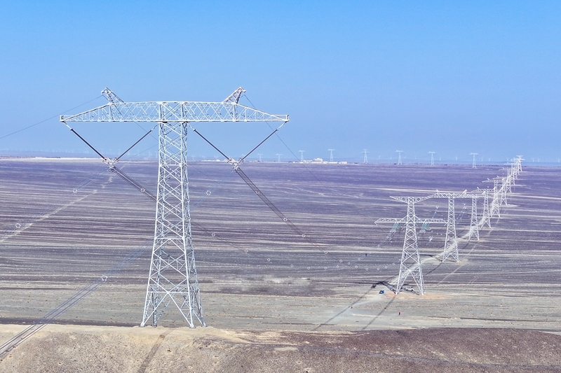在新疆昌吉回族自治州木壘哈薩克自治縣拍攝的±1100千伏昌吉-古泉特高壓直流輸電線路(7月5日攝)。