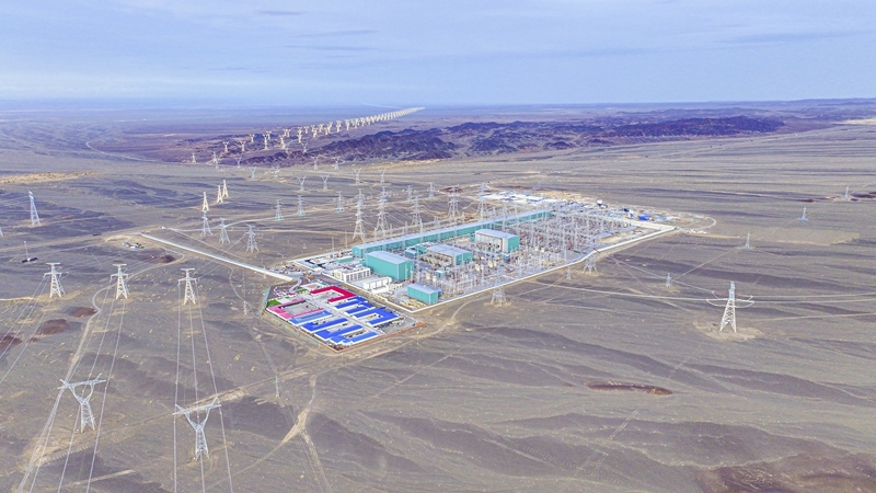 9月22日在新疆巴音郭楞蒙古自治州若羌縣拍攝的三峽集團(tuán)“疆電外送”第四通道電源項(xiàng)目施工現(xiàn)場(無人機(jī)照片)。