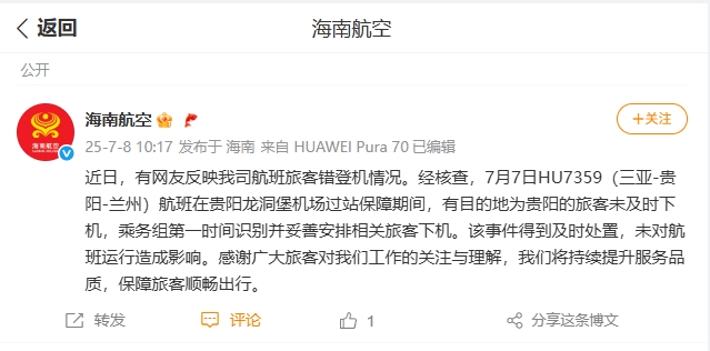 據(jù)海南航空官方微博消息,近日,有網(wǎng)友反映海南航空航班旅客錯登機情況。經(jīng)核查,7月7日HU7359(三亞-貴陽-蘭州)航班在貴陽龍洞堡機場過站保障期間,有目的地為貴陽的旅客未及時下機,乘務組第一時間識別并妥善安排相關旅客下機。該事件得到及時處置,未對航班運行造成影響。