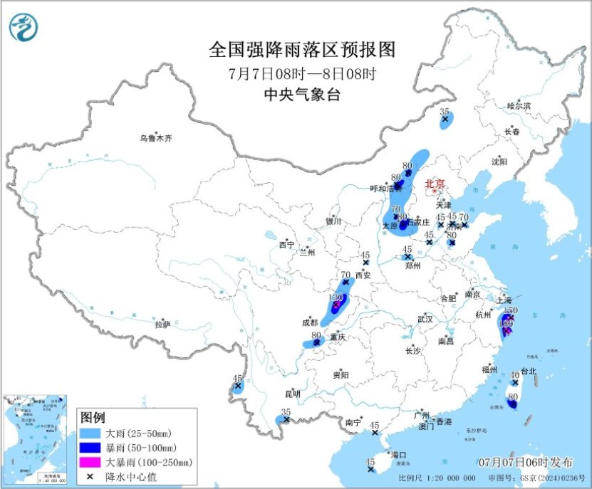 預(yù)計(jì),7月7日08時至8日08時,浙江東部、內(nèi)蒙古中部、山西中北部、河北西北部和西南部、山東北部、河南西北部、陜西西南部、四川東部、云南西南部、臺灣島等地部分地區(qū)有大到暴雨,其中,浙江東部、四川東部等地部分地區(qū)有大暴雨(100~180毫米)。上述部分地區(qū)伴有短時強(qiáng)降水(最大小時降雨量20~50毫米,局地可超過70毫米),局地有雷暴大風(fēng)等強(qiáng)對流天氣。中央氣象臺7月7日06時繼續(xù)發(fā)布暴雨藍(lán)色預(yù)警。
