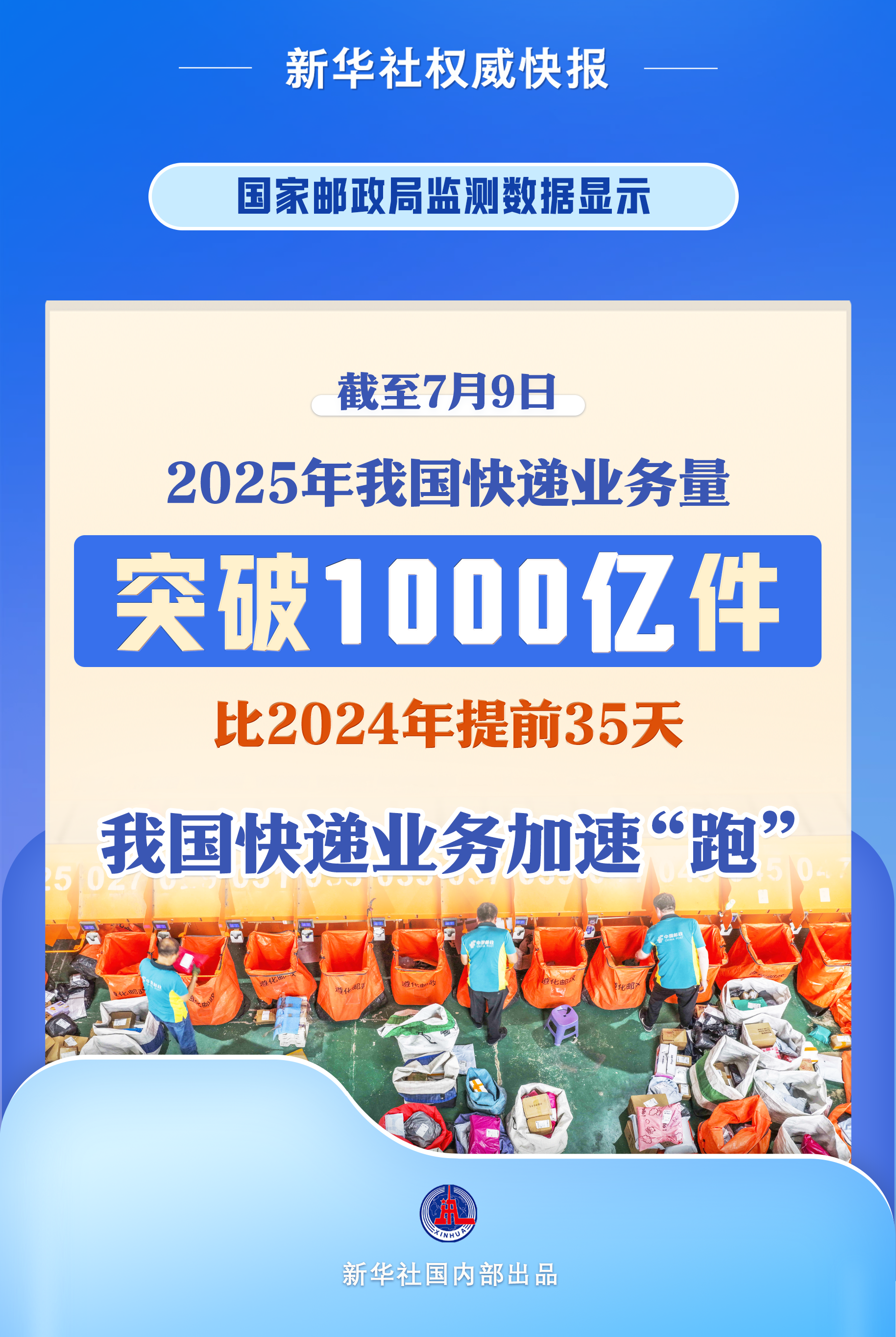 新華社北京7月10日電(記者葉昊鳴)記者10日從國家郵政局了解到,根據(jù)國家郵政局監(jiān)測數(shù)據(jù)顯示,截至7月9日,2025年我國快遞業(yè)務(wù)量突破1000億件,比2024年達(dá)到千億件提前35天。