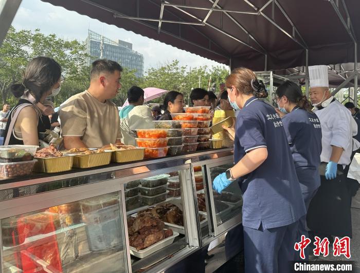 近日傍晚,該酒店外擺攤位推出了熟食、涼菜、主食及高檔特色菜,攤位前排起長隊。四五十位酒店服務(wù)人員統(tǒng)一身著工作服,忙著招呼顧客。