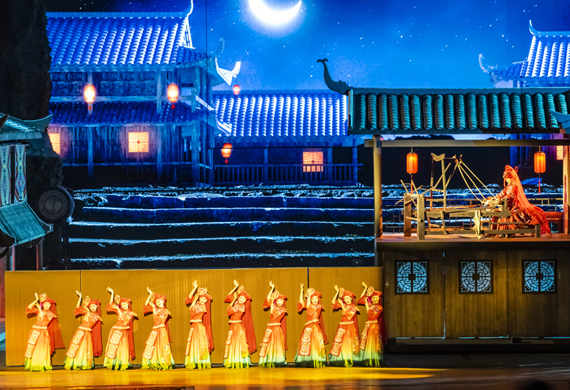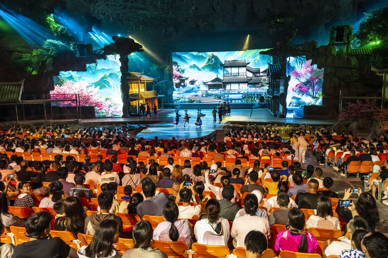 7月10日,游客在利川市騰龍洞的洞穴內(nèi)觀看實景劇《夷水麗川》。