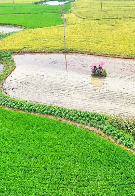 7月13日,湖南省衡陽市衡東縣霞流鎮(zhèn)農(nóng)民駕駛農(nóng)機進(jìn)行晚稻插秧工作(無人機照片)。