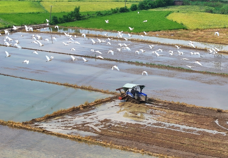 7月13日,湖南省衡陽市衡東縣霞流鎮(zhèn)農(nóng)民駕駛農(nóng)機翻耕稻田(無人機照片)。