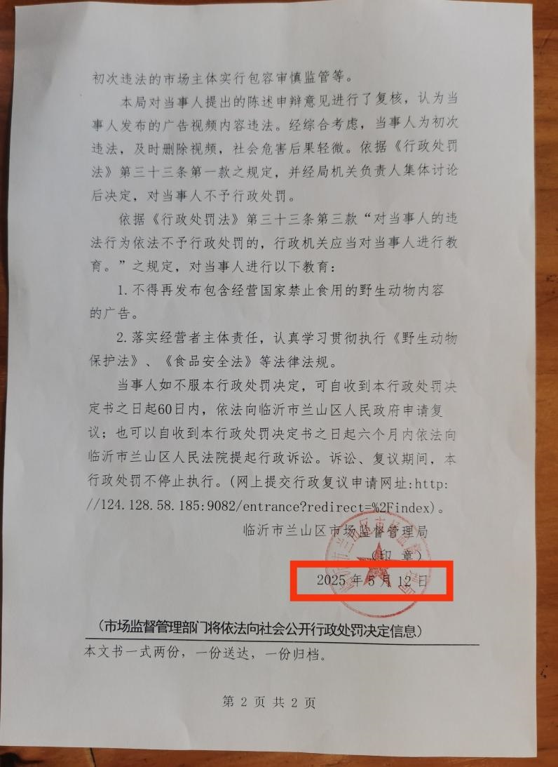 負(fù)責(zé)代理此案的龔華律師告訴記者,今晨七點(diǎn),蘭山區(qū)市場監(jiān)管局工作人員到飯館送達(dá)《不予行政處罰決定書》,落款日期為5月12日,并要求當(dāng)事人簽署送達(dá)回執(zhí)。