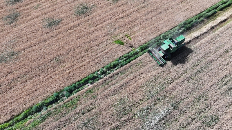 7月15日,收割機(jī)在銀川市賀蘭縣立崗鎮(zhèn)蘭星村收獲小麥(無(wú)人機(jī)照片)。