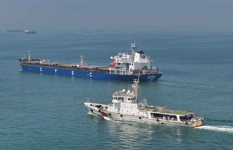 7月18日,曹妃甸海事局的巡邏船(前)在唐山港曹妃甸港區(qū)海域?yàn)檫M(jìn)出港輪船護(hù)航(無(wú)人機(jī)照片)。
