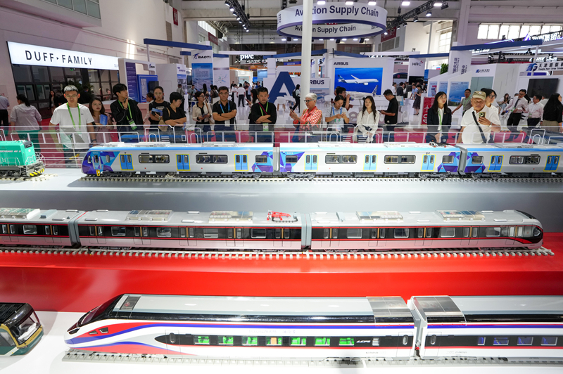 參觀者在先進制造鏈展區(qū)中國中車展臺參觀展出的列車產(chǎn)品模型(7月16日攝)。