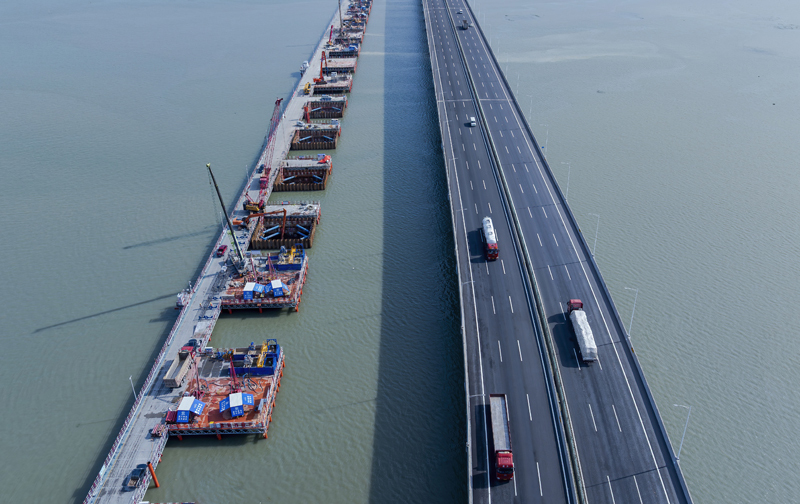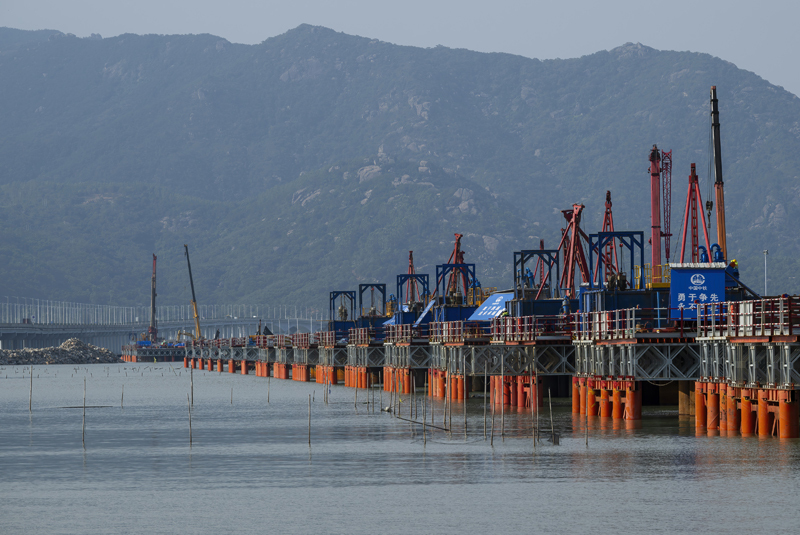 這是漳江灣跨海特大橋主棧橋樁基施工現(xiàn)場(chǎng)(7月16日攝)。