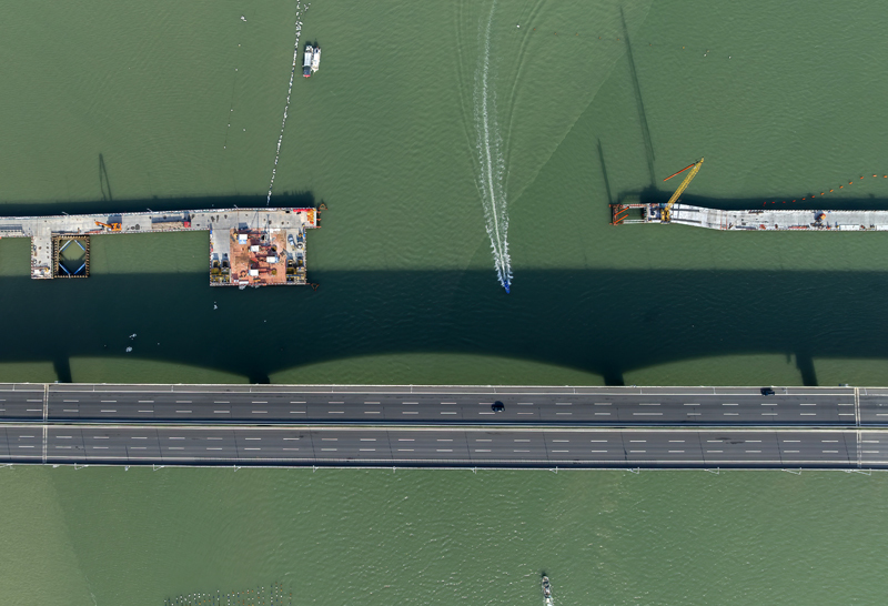 這是漳江灣跨海特大橋施工現(xiàn)場(chǎng)(7月16日攝,無(wú)人機(jī)照片)。