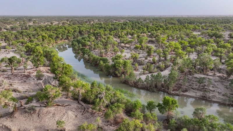 8月6日,在新疆巴音郭楞蒙古自治州尉犁縣境內拍攝的胡楊林(無人機照片)。