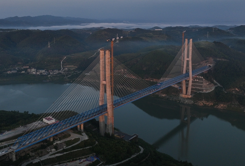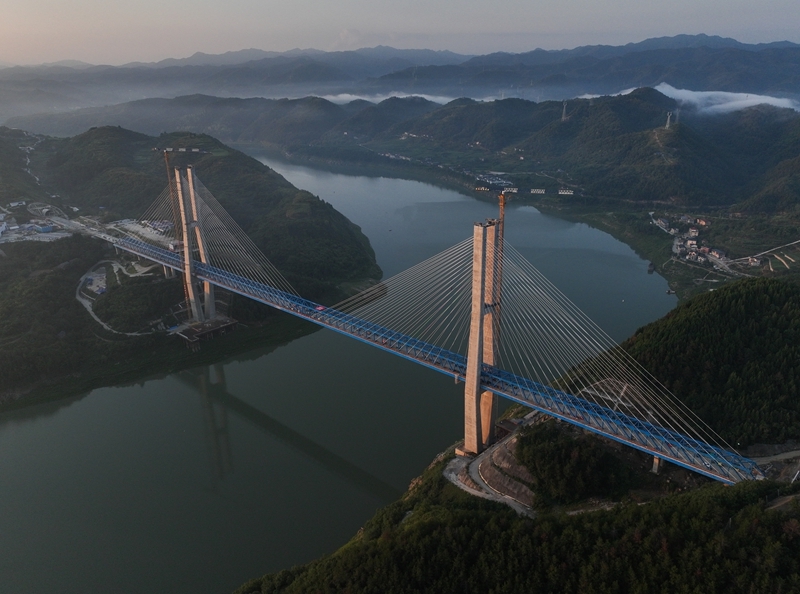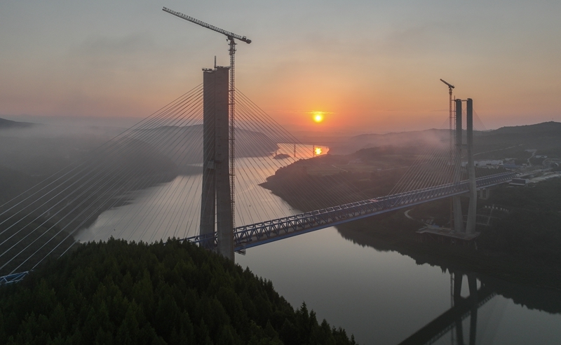 8月18日,由中鐵十一局承建的西安至十堰高速鐵路(簡(jiǎn)稱“西十高鐵”)漢江特大橋鋼桁梁順利合龍。漢江特大橋位于湖北省十堰市,跨越丹江口水庫(kù)庫(kù)區(qū),是西十高鐵全線控制性工程,全長(zhǎng)917.45米,主跨420米。本次合龍的鋼桁梁全長(zhǎng)840米、寬11米、高9.4米,采用漸變?nèi)氰焓浇Y(jié)構(gòu),最重桁節(jié)36.4噸。
