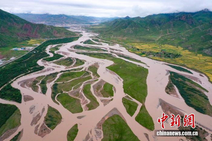 2023年8月22日,航拍青海省玉樹藏族自治州囊謙縣境內(nèi)的扎曲河網(wǎng)狀水系。扎曲河是瀾滄江上游主要干流之一,縱橫交錯的河水在群山中蜿蜒流淌,形成獨特的高原河流景觀。中新社記者 馬銘言 攝