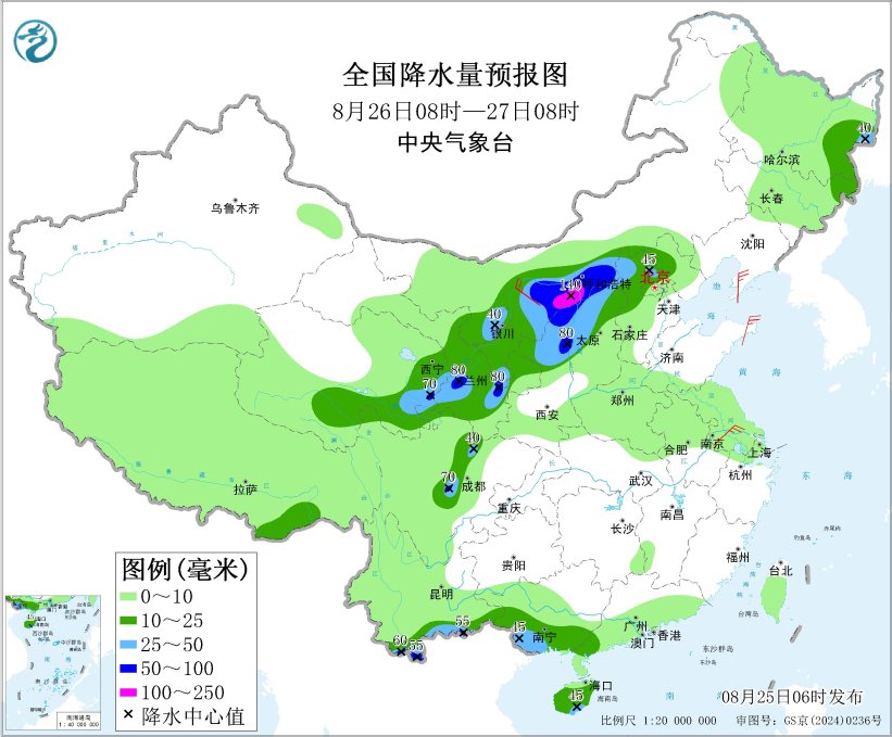 8月26日8時(shí)至27日8時(shí),青海東部和南部、甘肅中東部、寧夏、陜西北部、內(nèi)蒙古中西部、山西中北部、河北西北部、北京西部和北部、四川盆地西部、云南南部、廣西南部、海南島等地的部分地區(qū)有中到大雨,其中,青海東南部、甘肅東部、陜西西北部、內(nèi)蒙古中部、山西北部、云南南部等地的部分地區(qū)有暴雨,局地大暴雨(100~140毫米)。內(nèi)蒙古西部、遼東半島、山東半島等地部分地區(qū)有4~5級(jí)風(fēng)。