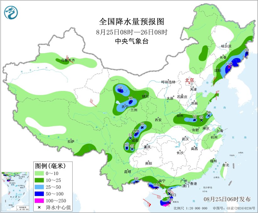 預(yù)計(jì),8月25日8時(shí)至26日8時(shí),青海東部、甘肅中部、黑龍江東南部、吉林東部、遼寧東部、河南東部、蘇皖中北部、四川盆地西部和北部、云南東南部、廣西南部、廣東西南部沿海、海南島大部等地部分地區(qū)有大到暴雨,其中,吉林東南部、四川盆地西北部、廣西南部沿海、海南島南部等地部分地區(qū)有大暴雨(100~130毫米)。上述部分地區(qū)伴有短時(shí)強(qiáng)降水(最大小時(shí)降雨量20~60毫米,局地可超過80毫米),局地有雷暴大風(fēng)等強(qiáng)對(duì)流天氣。中央氣象臺(tái)8月25日6時(shí)發(fā)布暴雨藍(lán)色預(yù)警。