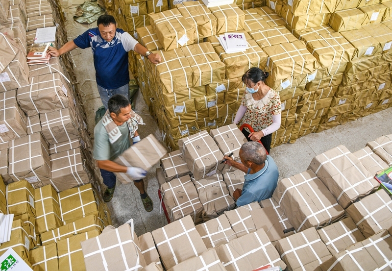 8月25日,在湖南省永州市道縣新華書(shū)店倉(cāng)庫(kù),工作人員在搬運(yùn)新學(xué)期教材。