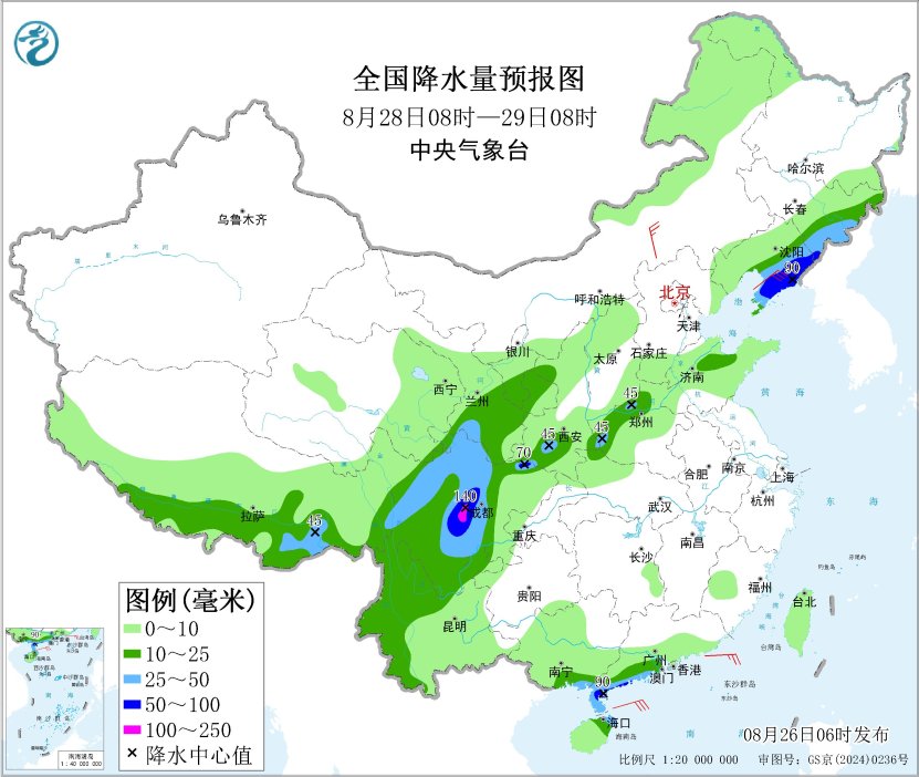 8月28日08時至29日08時,吉林東部、遼寧中東部、甘肅南部、寧夏、陜西、山東北部、河南北部和西部、四川盆地西部、川西高原、云南西部、西藏南部、廣東西南部、廣西南部、海南島等地的部分地區(qū)有中到大雨,其中,遼寧東部和南部、陜西南部、四川盆地西部、廣東西南部等地的部分地區(qū)有暴雨,局地大暴雨(100~140毫米)。內(nèi)蒙古中東部、遼東半島、山東半島等地的部分地區(qū)有4~6級風(fēng)。渤海有6~7級、陣風(fēng)8級的東北風(fēng),黃海北部海域有5~7級、陣風(fēng)8級的偏南風(fēng),南海東北部海域有5~7級、陣風(fēng)8級的偏東風(fēng)。