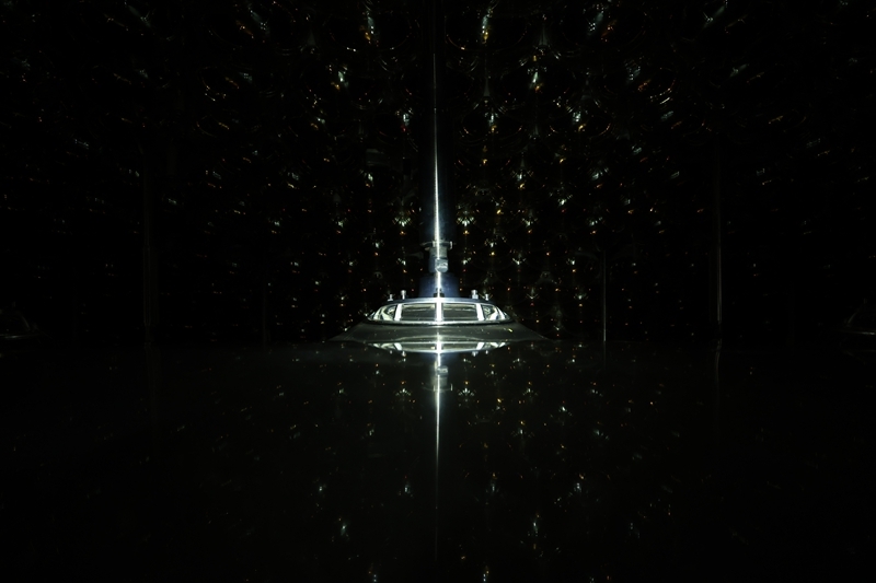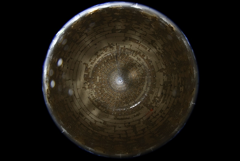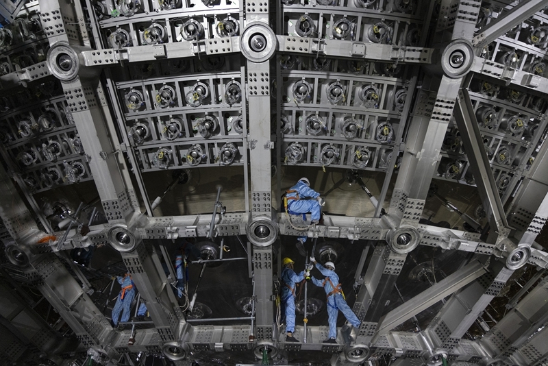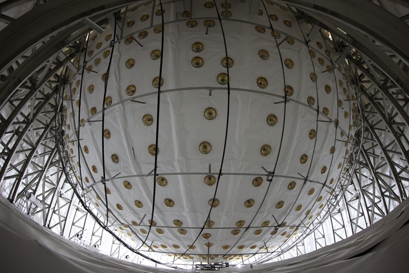 從江門中微子實(shí)驗(yàn)球底拍攝的中心探測器有機(jī)玻璃球(2024年11月22日攝)。