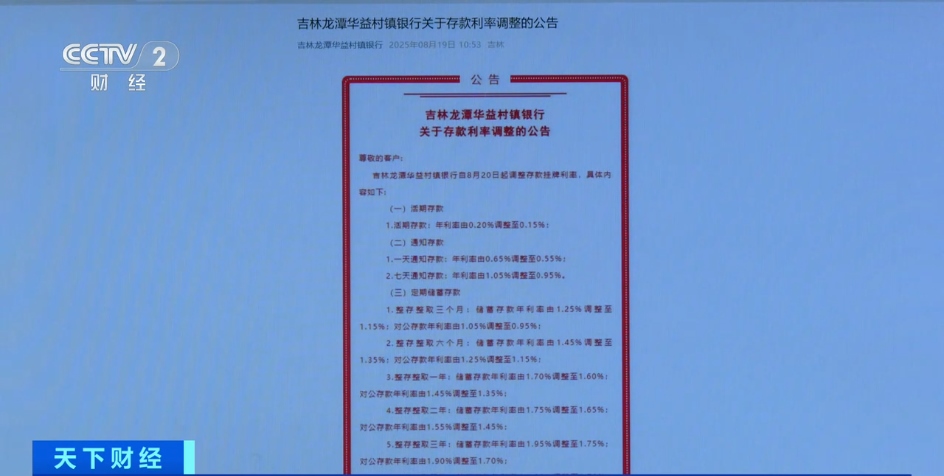 此外,吉林龍?zhí)度A益村鎮(zhèn)銀行自8月20日起調整存款利率,活期存款年利率由0.2%調整至0.15%,個人儲蓄定期存款3個月、6個月、1年期、2年期的年利率均下調10個基點,3年期、5年期則下調20個基點。