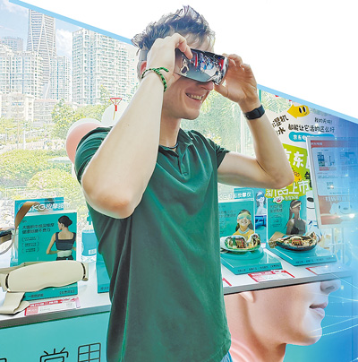 在深圳福田區(qū)華強北群星廣場購物中心,來自德國的小伙子凱試戴電子眼部按摩儀。