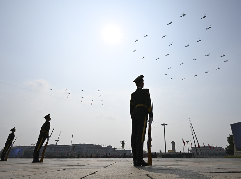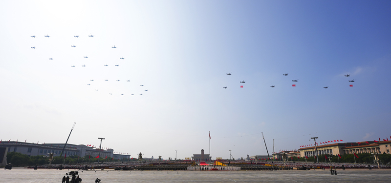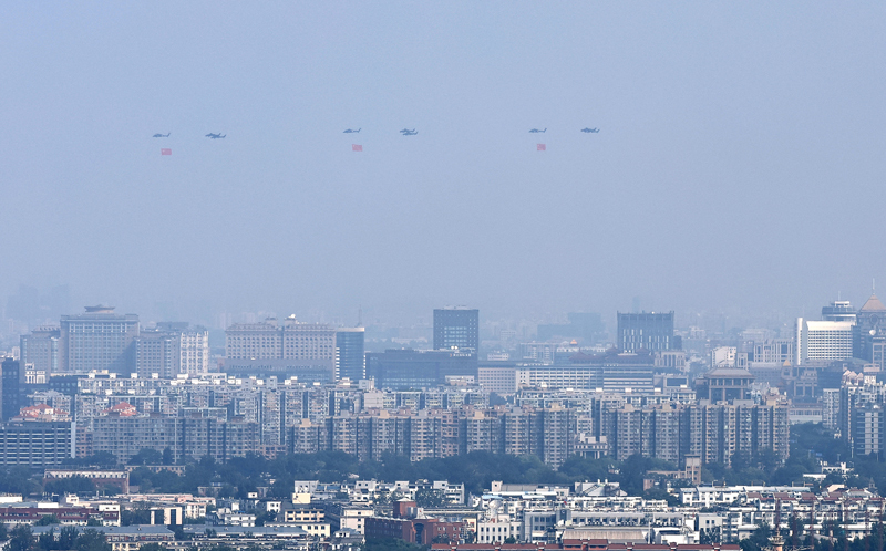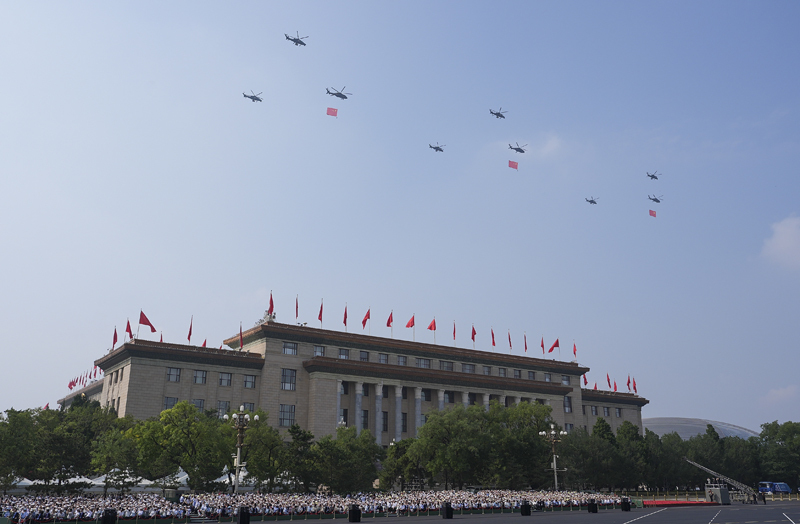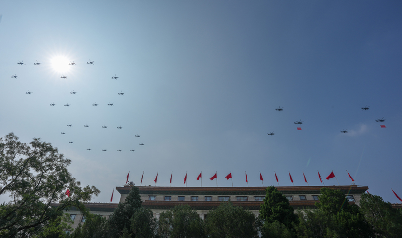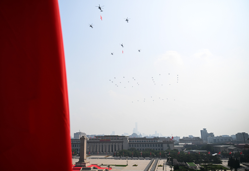 9月3日,紀(jì)念中國人民抗日戰(zhàn)爭暨世界反法西斯戰(zhàn)爭勝利80周年大會在北京隆重舉行。這是空中護(hù)旗梯隊飛過天安門廣場上空,26架直升機(jī)匯成巨大的“80”字樣。