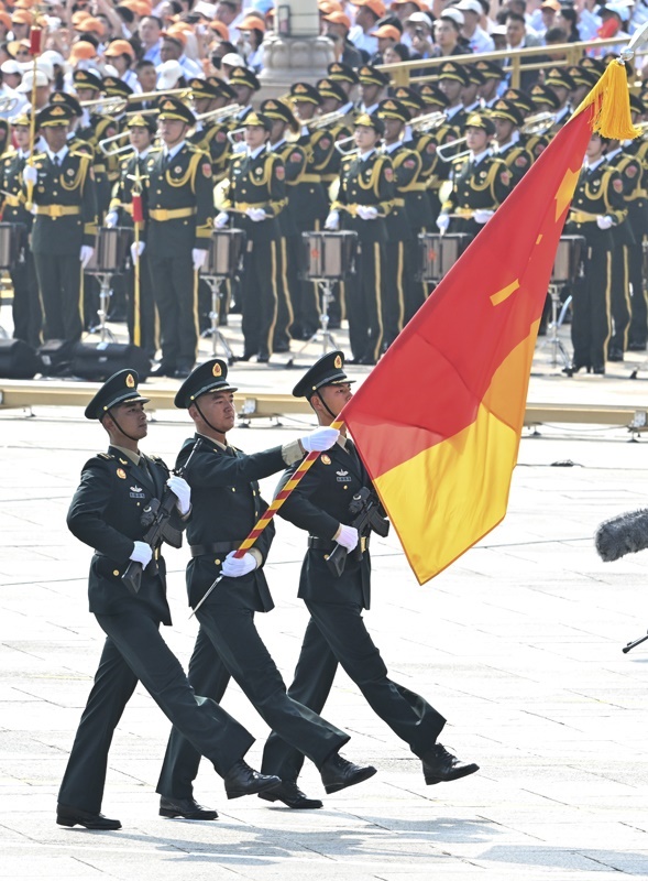 9月3日,紀(jì)念中國(guó)人民抗日戰(zhàn)爭(zhēng)暨世界反法西斯戰(zhàn)爭(zhēng)勝利80周年大會(huì)在北京隆重舉行。這是國(guó)旗護(hù)衛(wèi)隊(duì)在天安門廣場(chǎng)列隊(duì)。