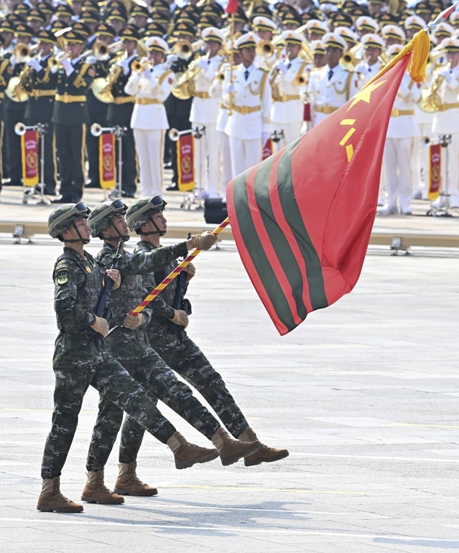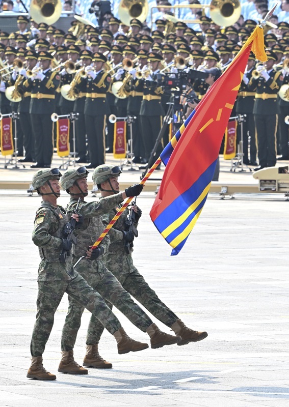 9月3日,紀(jì)念中國(guó)人民抗日戰(zhàn)爭(zhēng)暨世界反法西斯戰(zhàn)爭(zhēng)勝利80周年大會(huì)在北京隆重舉行。這是戰(zhàn)旗方隊(duì)接受檢閱。