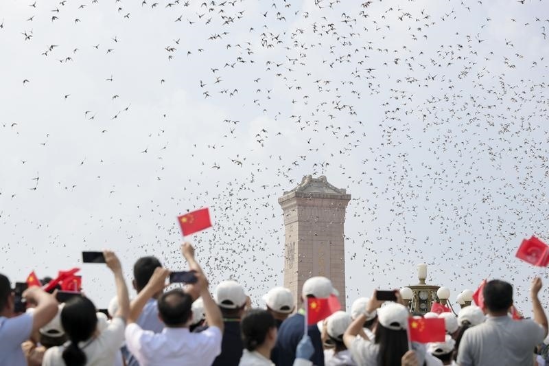 9月3日,紀(jì)念中國人民抗日戰(zhàn)爭暨世界反法西斯戰(zhàn)爭勝利80周年大會(huì)在北京隆重舉行。這是紀(jì)念大會(huì)現(xiàn)場放飛鴿子。