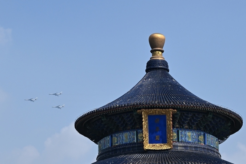9月3日,紀(jì)念中國人民抗日戰(zhàn)爭暨世界反法西斯戰(zhàn)爭勝利80周年大會在北京隆重舉行。這是在北京天壇公園拍攝的轟炸機(jī)梯隊。