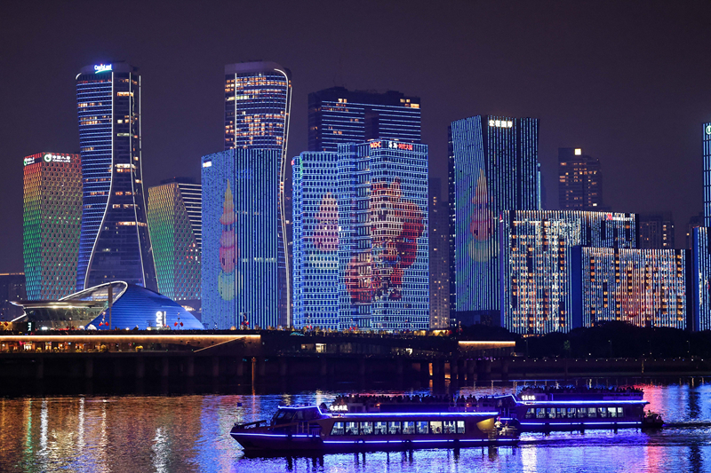 10月2日,游客乘坐游船觀賞杭州錢塘江沿岸夜景。
