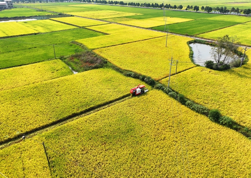 10月11日,湖南省衡陽市衡山縣白果鎮(zhèn)村民駕駛農(nóng)機收割稻谷(無人機照片)。
